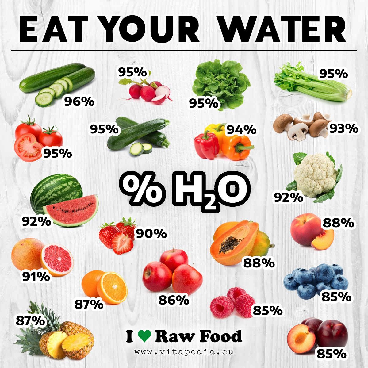 Na obrazku poniżej — procentowa zawartość wody w surowych roślinach jadalnych:
