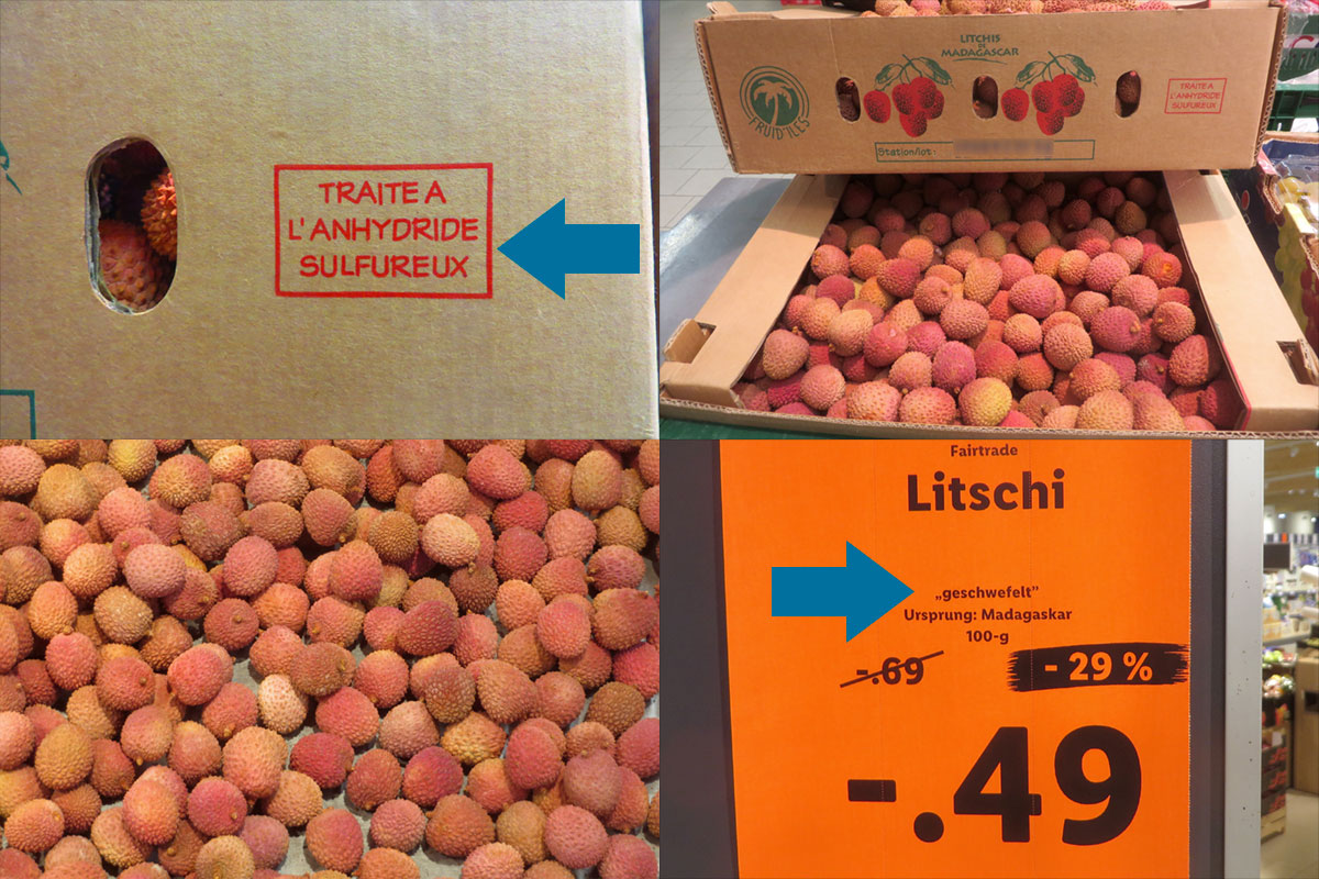 Siarkowanie jest kolejną metodą konserwacji żywności. Celem siarkowania jest utrzymanie „ładnego wyglądu” suszonych i świeżych owoców (i warzyw) poprzez dodanie dwutlenku siarki, który wiąże się z fenolami w miąższu, aby uniemożliwić ich naturalne łączenie się z enzymami. Dwutlenek siarki (E220) może wywołać trudności w oddychaniu, podrażnienie dróg oddechowych, skurcze oskrzeli, opuchnięcie twarzy, wysypkę, astmę, zmiany funkcjonowania płuc, pogorszenie wad serca oraz może zaszkodzić rozwojowi płodu. Siarkowane mogą być nie tylko soki, przeciery, wina, marynaty, ale suszone, a także świeże owoce i warzywa – np. liczi z Madagaskaru albo suszone i siarkowane morele (niesiarkowane suszone morele są brązowe, a nie jaskrawo pomarańczowe!).