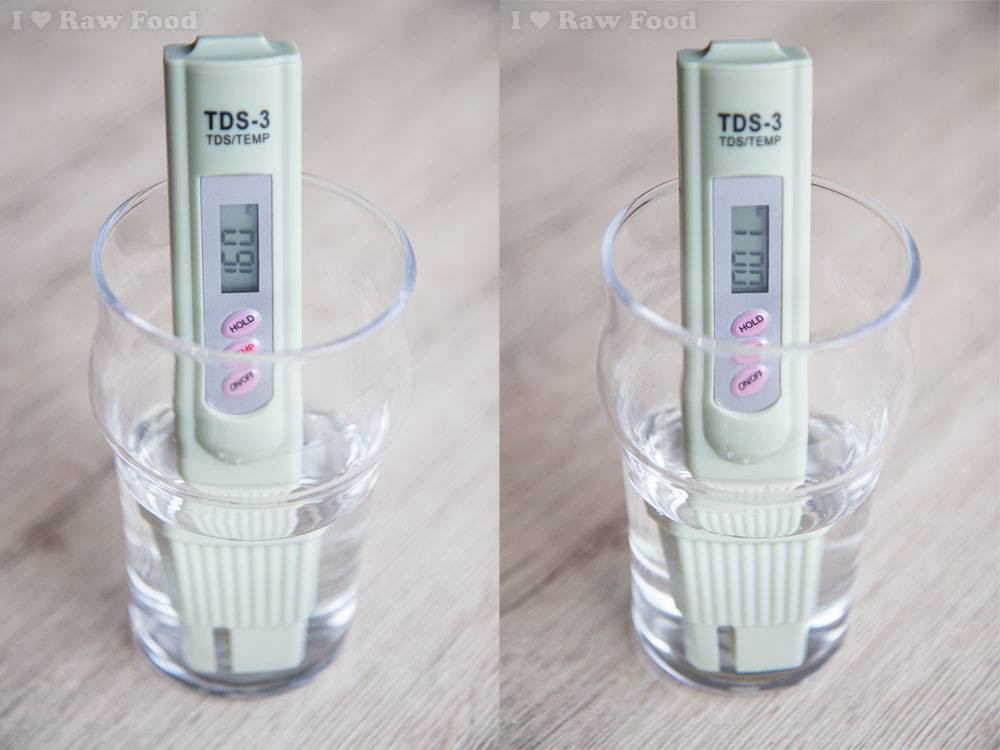 Na zdjęciu poniżej: woda z kranu = około 160 ppm, po destylacji parowej = około 1 ppm (ppm = parts per milion = części na milion).