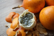 Tip: the white layer/sheath between the orange skin and the pulp is—as in oranges—edible and healthy! (health benefits, texture and taste are similar to those of oranges)